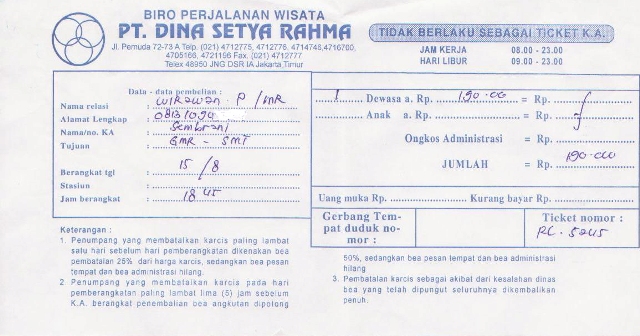 Jum’at siang dapat tiketnya, langsung booking trus ambil. Untung tempatnya deket jadi bisa diambil segera. Walaupun gua kudu nambah biaya administrasi, tapi menurut gua ini lebih masuk akal daripada gua datang ke Gambir tanpa kepastian dapat kursi atau tidak.