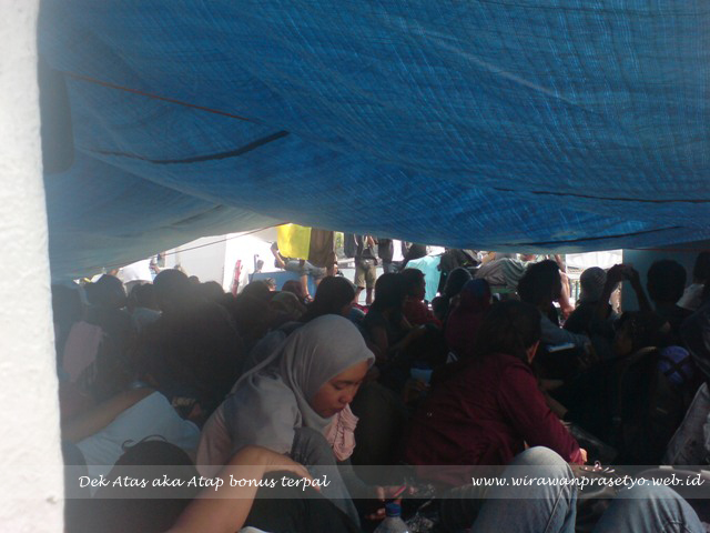 Sedangkan dek atap hanyalah atap dan ada terpal dengan ukuran yang sangat terbatas. Jadi siap2-lah ketika perjlanan long weakend pasti ramai sekali dan semoga mendapatkan posisi yang sangat nyaman. Ada baiknya membawa alas duduk sendiri.